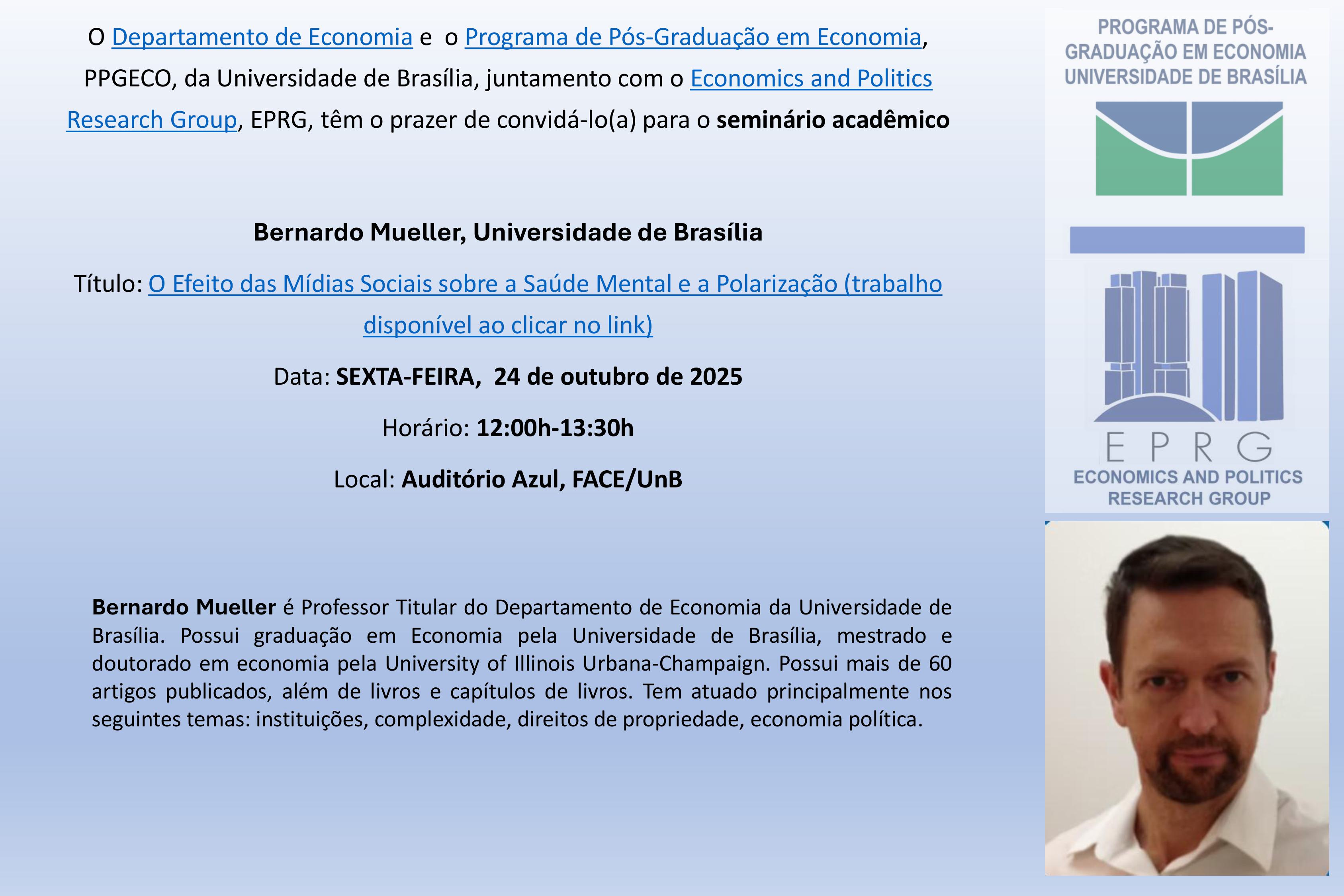 O Departamento de Economia, o Programa de Pós-Graduação em Economia, PPGECO, da Universidade de Brasília e o Economics and Politics Research Group, EPRG, têm o prazer de convidá-lo(a) para o seminário acadêmico: