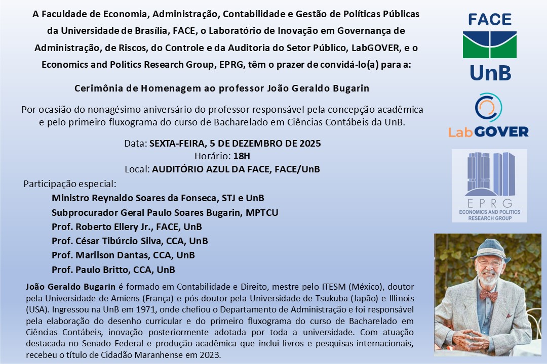 Nesta sexta-feira, dia 05/12/25, às 18h, a FACE, o LabGOVER e o EPRG homenagearão o professor João Bugarin, responsável pela elaboração do desenho curricular e do primeiro fluxograma do curso de Bacharelado em Ciências Contábeis da UnB, por ocasião de seu 90º aniversário.