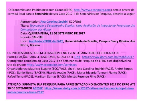 O Economics and Politics Research Group (EPRG, http://www.econpolrg.com), tem o prazer de convidá-lo(a) para o Seminário de seu Ciclo 2017-II de Seminários de Pesquisa, descrito a seguir.