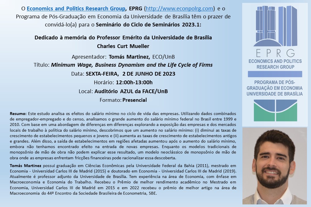 O Economics and Politics Research Group, EPRG (http://www.econpolrg.com) e o Programa de Pós-Graduação em Economia da Universidade de Brasília têm o prazer de convidá-lo(a) para o Seminário do Ciclo de Seminários 2023.1:
