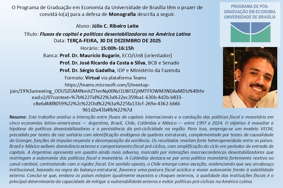 Nesta terça-feira, dia 30/12/25, às 15h, teremos a defesa da monografia de graduação do Júlio Ribeiro Leite, virtual.