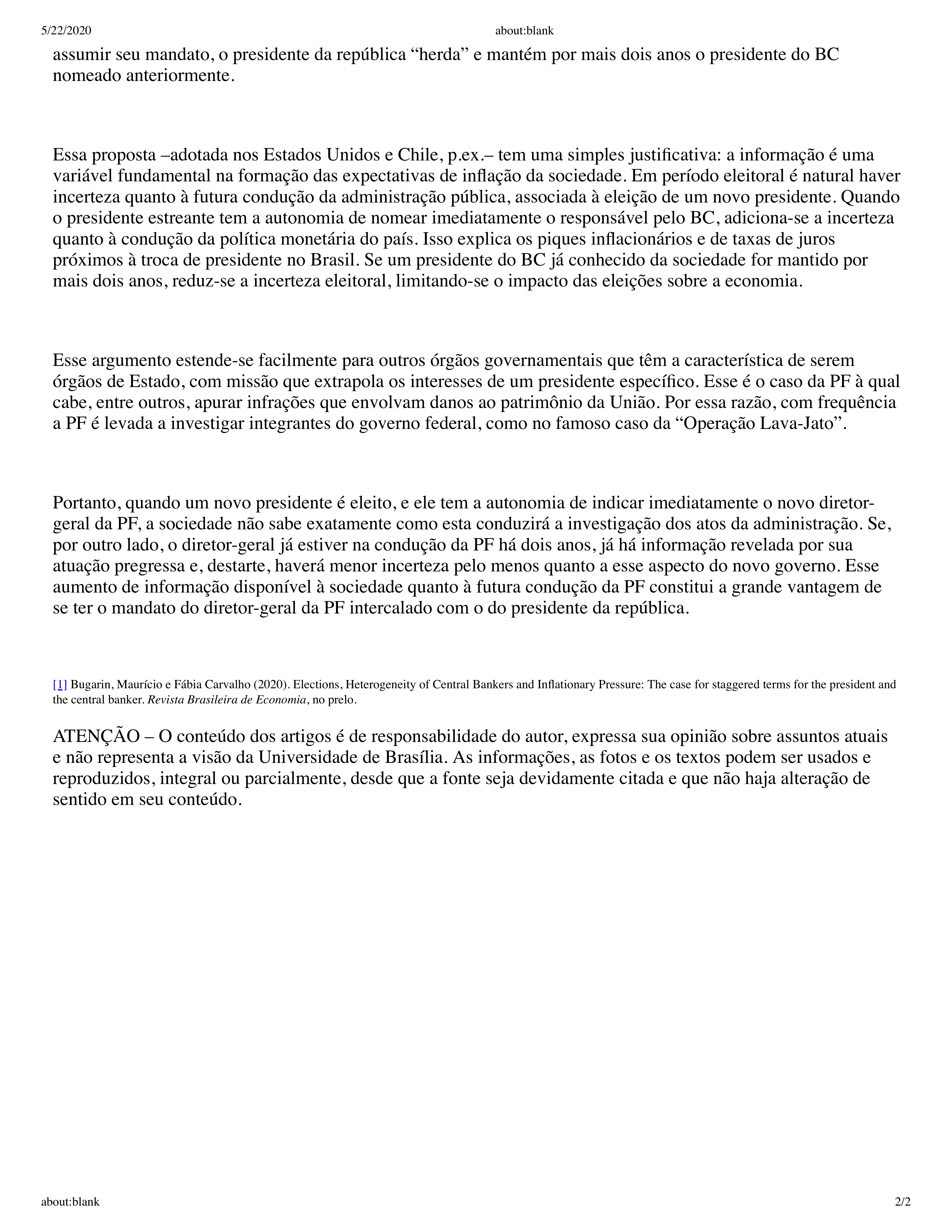 [2] Bugarin, Maurício e Fábia Carvalho (2020). Elections, Heterogeneity of Central Bankers and Inflationary Pressure: The case for staggered terms for the president and the central banker. Revista Brasileira de Economia, no prelo. Link para o trabalho: