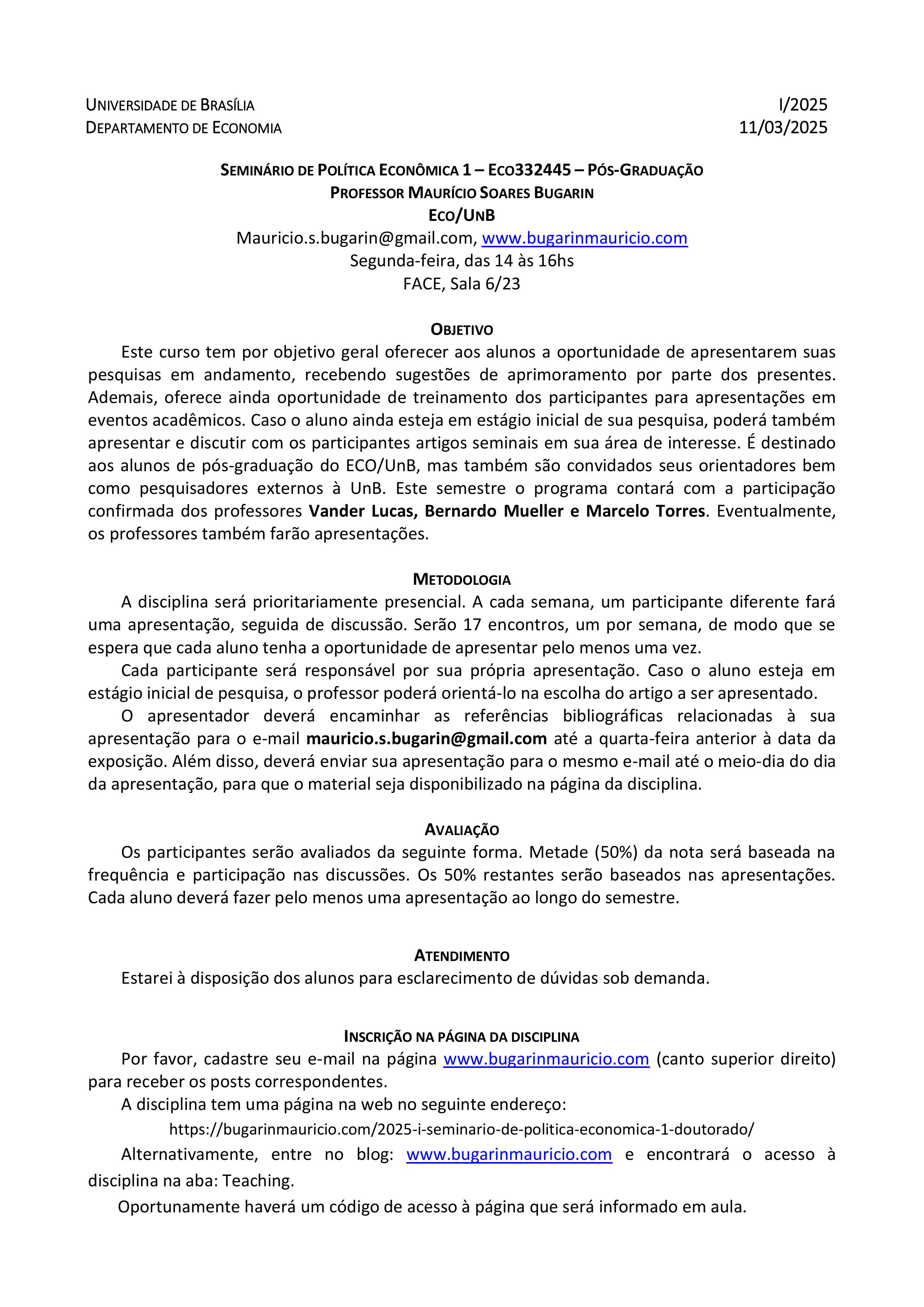 2025-1 Bugarin - Seminário de Política Econômica 1 - Plano de Ensino