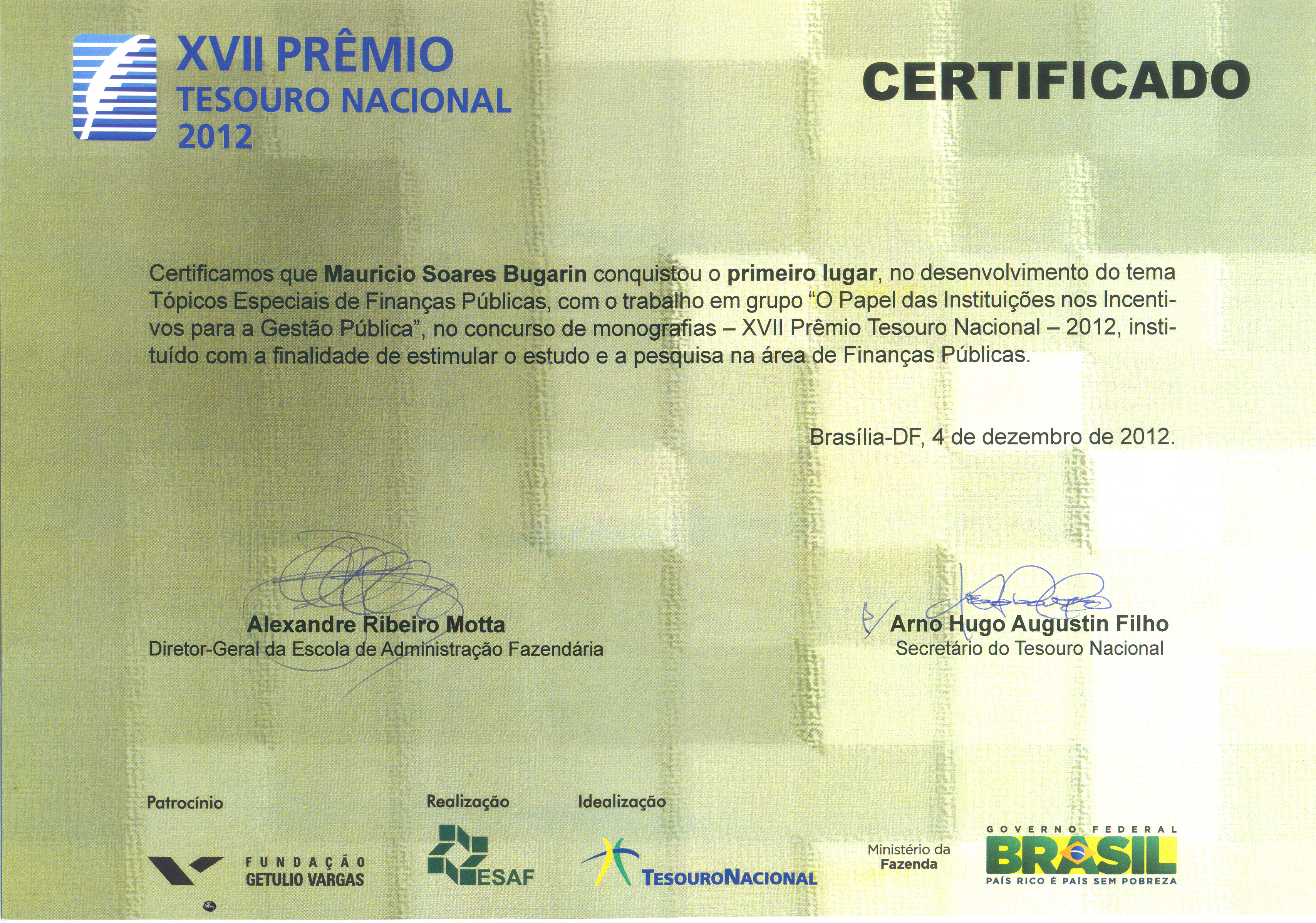20. XVII Treasury Secretariat Public Finance Award. Brazilian Treasury Secretariat, 2012.